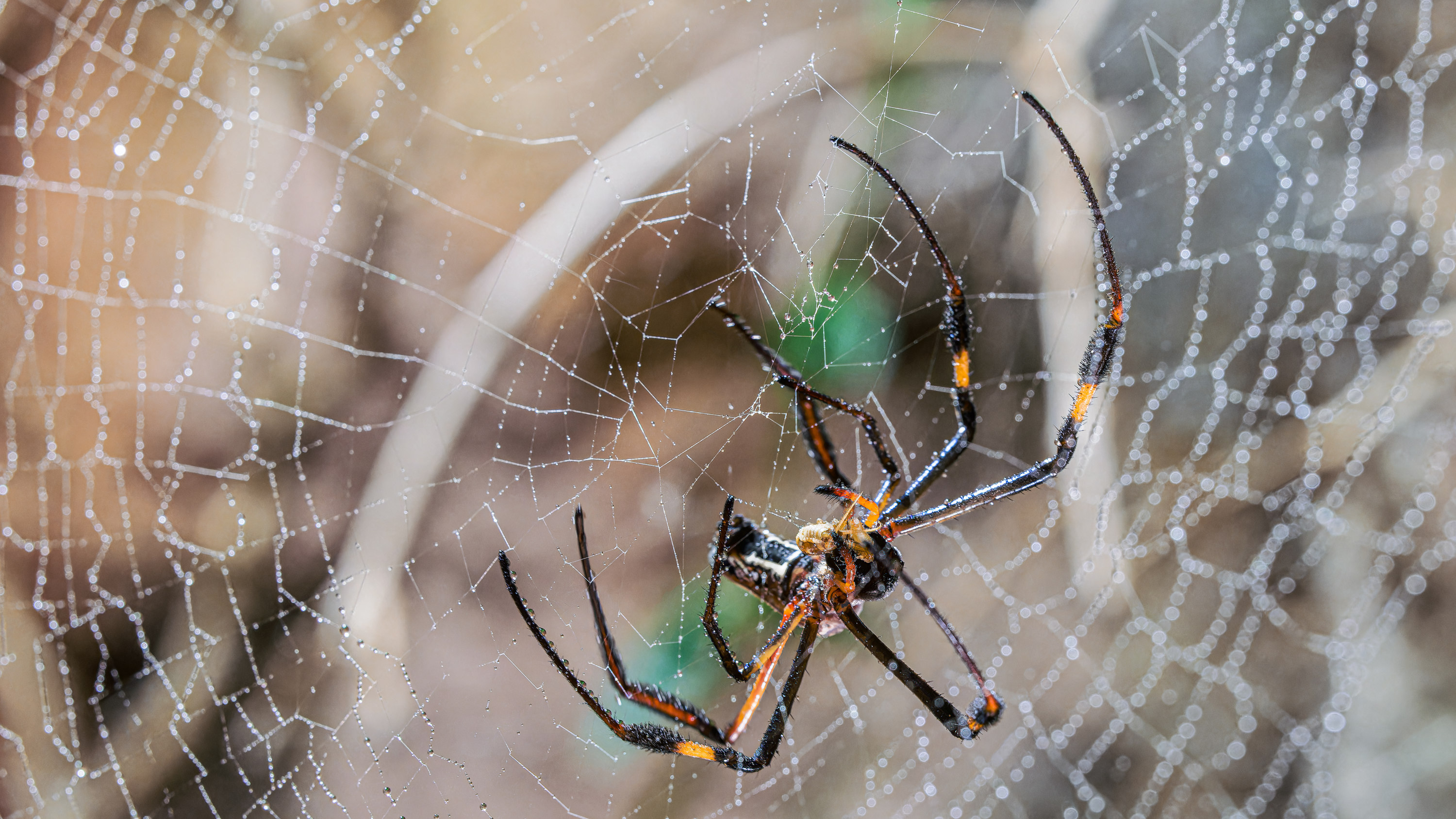 Nefila senegalská ve své silné, odolné a pružné síti ve viváriu v Rezervaci Dja. Foto: Petr Hamerník, Zoo Praha