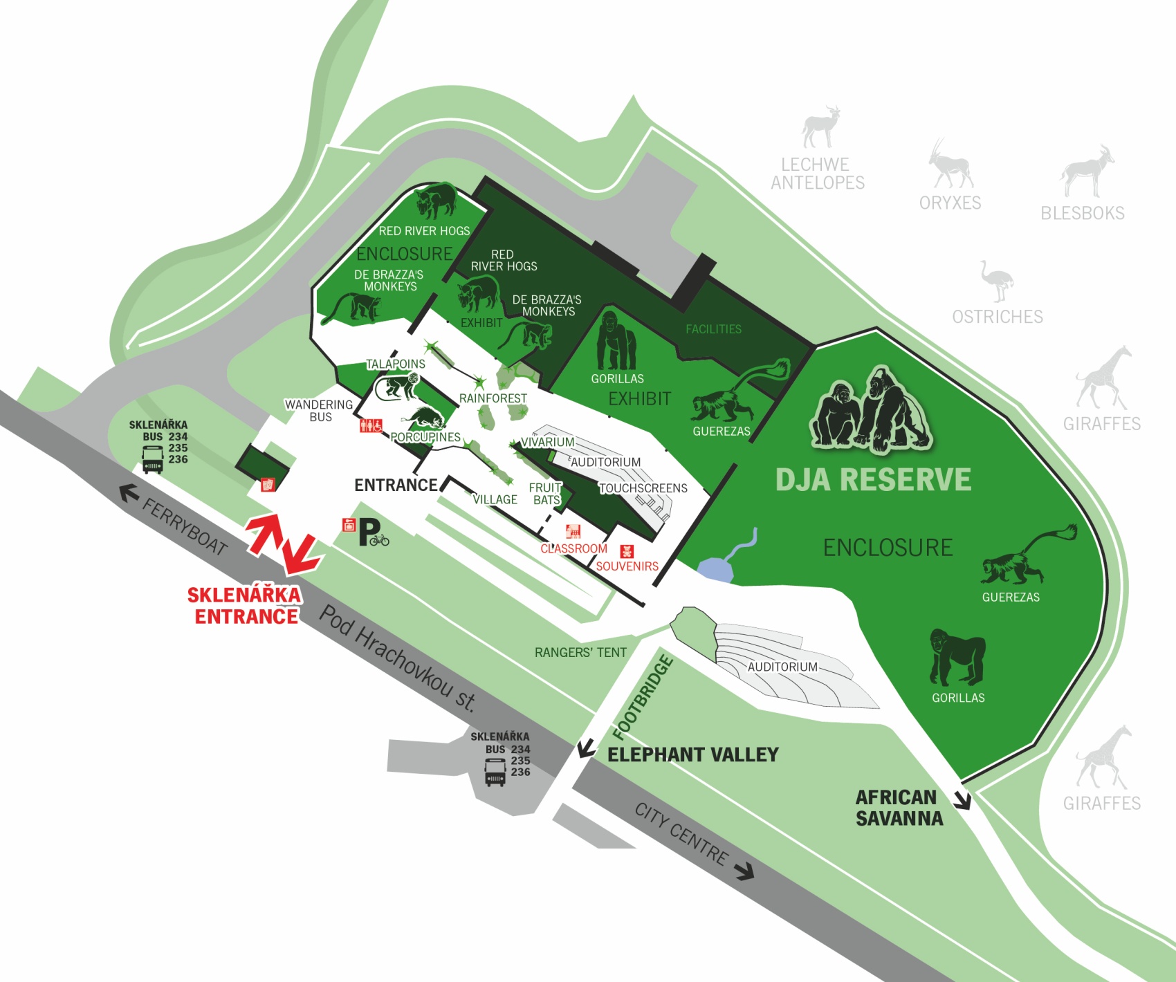 The pavilion can be reached via a footbridge from the western edge of the Elephant Valley, as well as by a path from the African House, which offers unexpected views of the giraffe enclosure. Additionally, a new zoo entrance has been created right in front of the pavilion, complete with a public bus stop (routes 234, 235, and 236 to the Zoo Praha – Sklenářka stop).