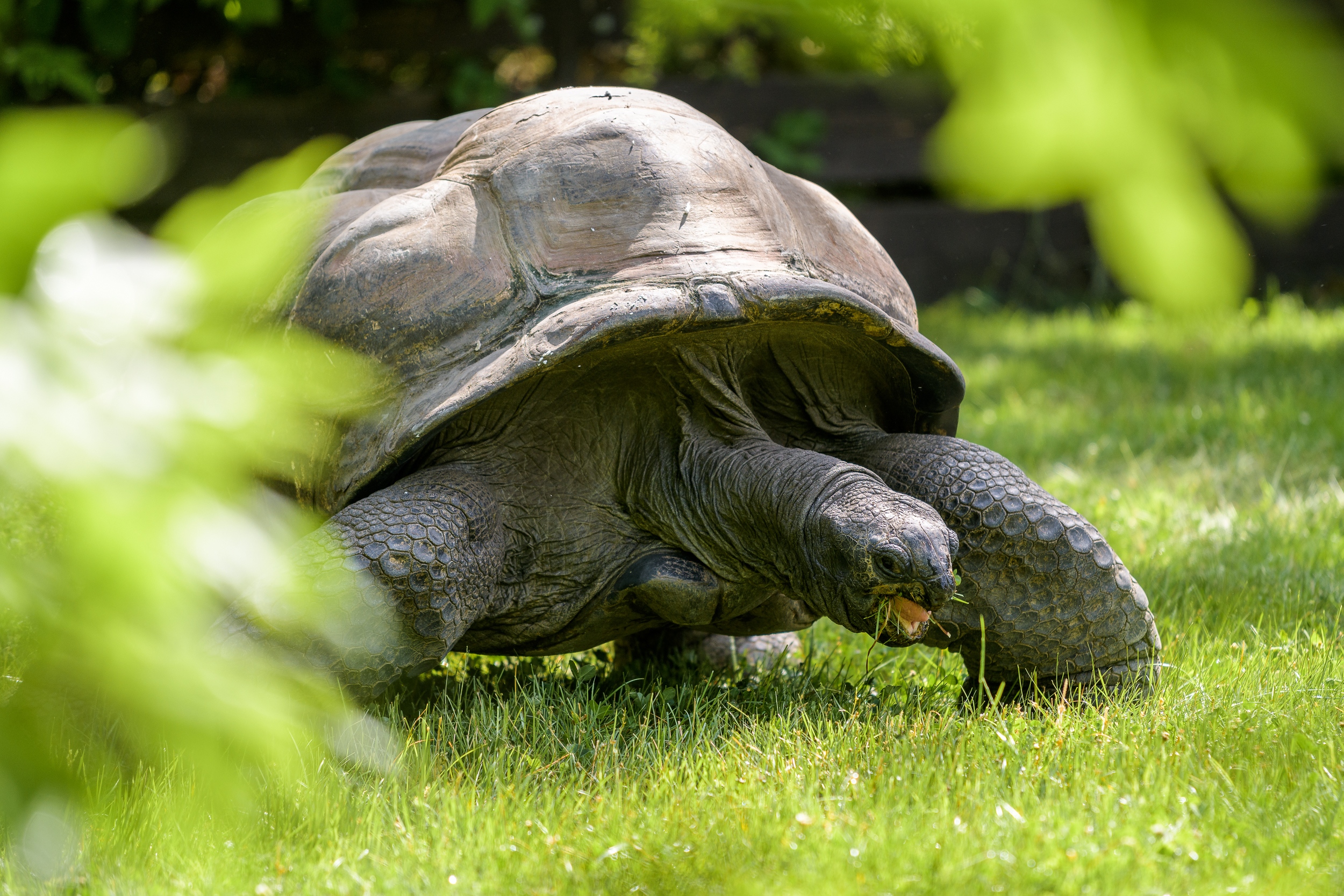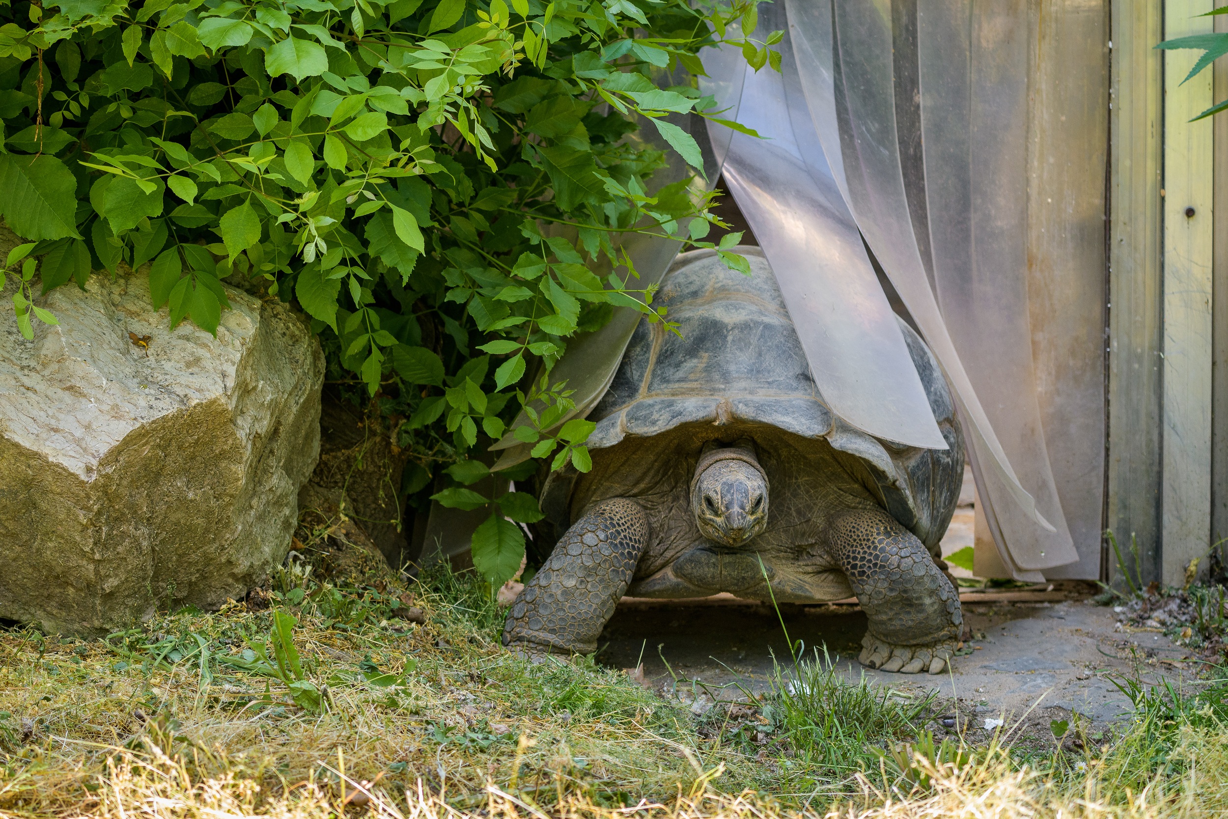 Želvy sloní a želvy obrovské po více než půl roce stráveném ve vnitřní expozici opět pobývají i venku. Bude-li tak o víkendu přát počasí, návštěvníci si jistě užijí pohled na tyto tropické želvy ve výběhu stejně, jako si ony užívají vyhřívání na sluníčku a pastvu na čerstvé trávě.
